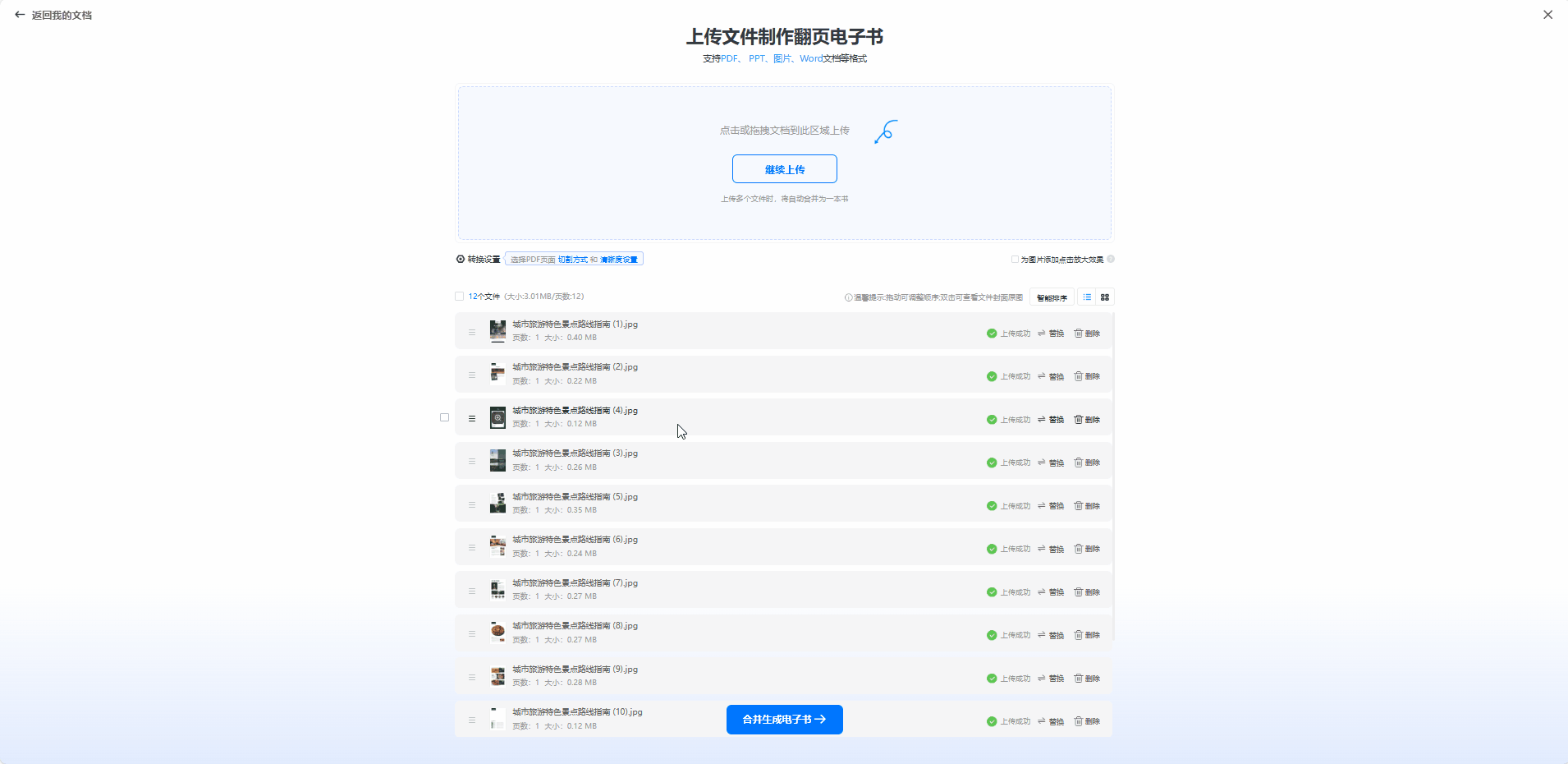 在云展网首页的【免费制作】,点击【上传图片】,拖拽图片或点击【单文件上传】/【多文件合并上传】上传你需要上传的图片后,可拖动图片以调整顺序,并点击【合并生成电子书】完成图片上传。