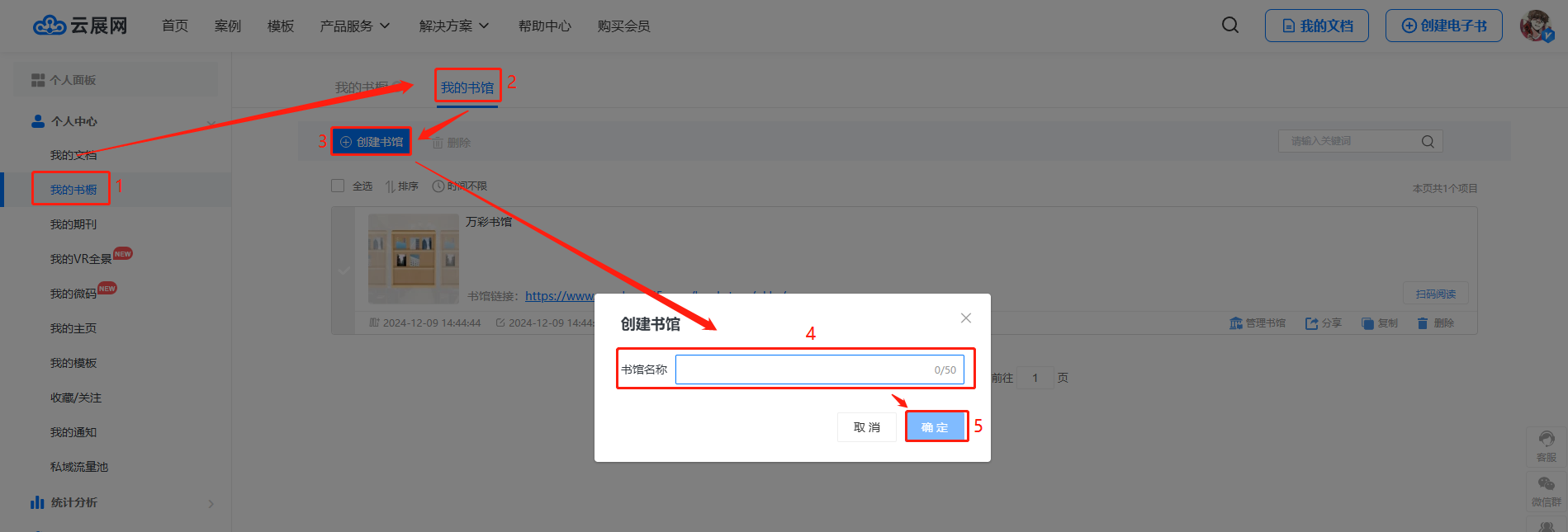 点击【我的书橱】,然后点击【我的书馆】,再点击【创建书馆】,输入书馆名称,点击确定。