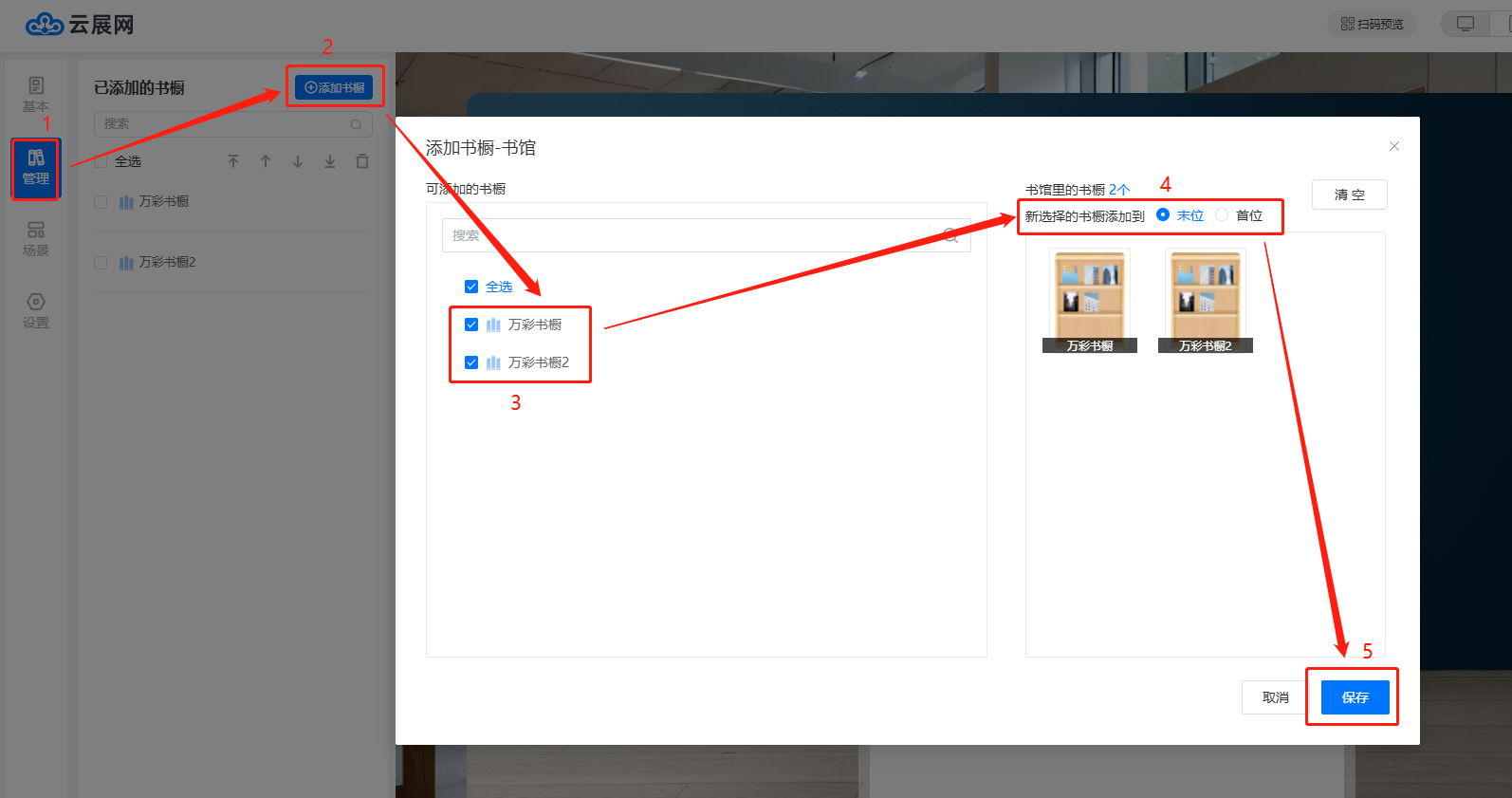 第一个步骤点击确定之后,会直接跳转到管理书橱的界面,点击【管理】,然后点击【添加书橱】,左侧勾选需要添加的书橱,右侧选择新选择的书橱添加的位置,点击右下角保存。