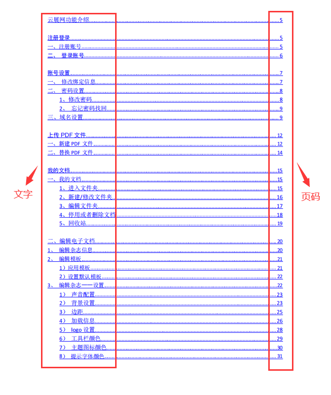 注意:多媒体编辑器里自定义添加的目录页暂时无法识别,必需是上传pdf制作的电子书,并且pdf上有目录页才能识别,目录必需是文字+页码的组合,如下图: