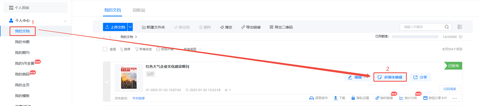 点进【我的文档】/【文档】,选择对应电子书,点击【多媒体编辑】/【内容编辑】。