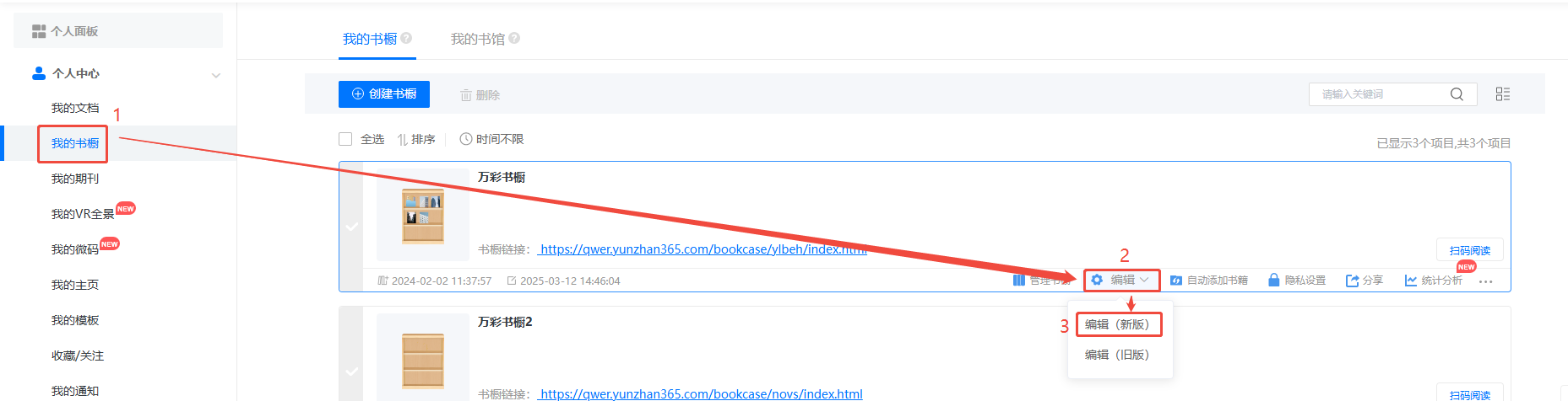 点击【我的书橱】,选择要自定义分享配置的书橱,点击【编辑】,选择【编辑(新版)】。