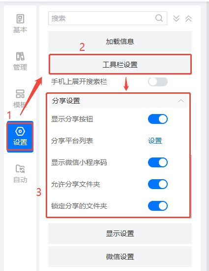 点击【设置】中的【工具栏设置】,下划找到【分享设置】,根据自己的需要进行设置。