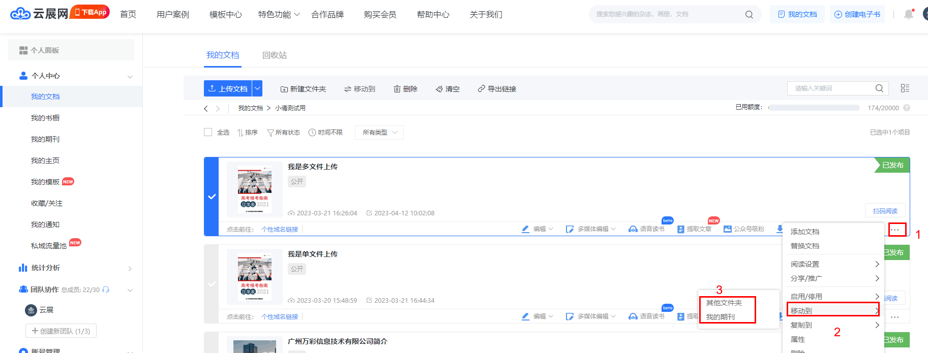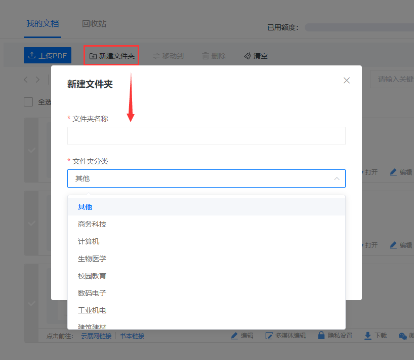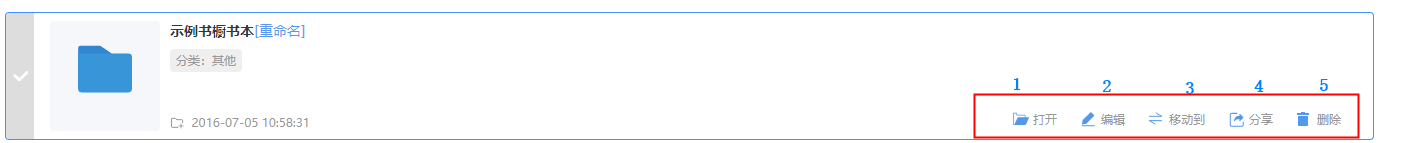 “我的文件夹”相关功能 一般情况下上传为默认文件夹。我们也可以自己新建文件夹。新建的文件夹分类后,在这文件夹上传的杂志会自动分类为所选择的文件。 也可以在此处修改文件夹: 1为打开文件夹 2为编辑文件夹 3为移动文件夹,可将整个文件夹移到其他文件夹里 4为分享文件夹,可以把文件夹以链接形式分享 5为删除文件夹,可将文件夹及文件夹里的书籍一并删除 已经上传好了的书籍可以通过编辑栏的按钮移动到另外一个文件夹去。