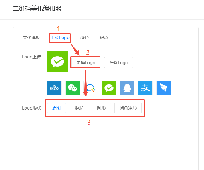 点击【上传logo】,再点击【更换logo】上传图片,最后选择【logo形状】。