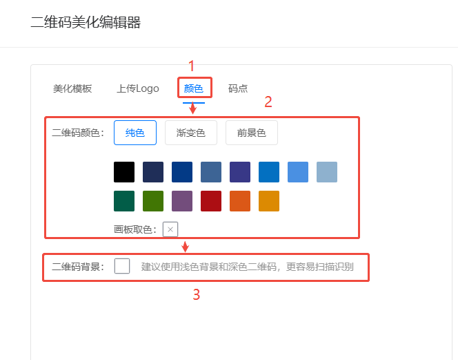点击【颜色】,下方设置二维码颜色和二维码背景色。