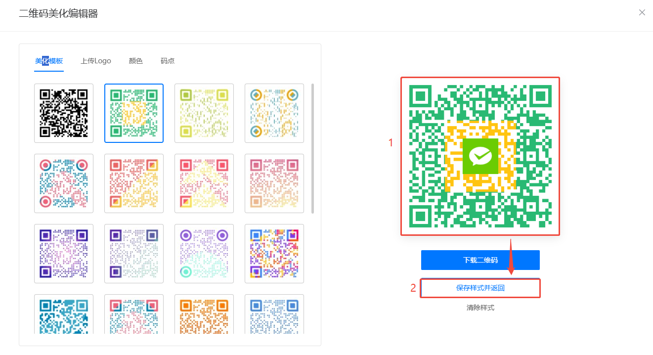 设置好之后在右侧可预览二维码样式,点击【保存样式并返回】即可保存。