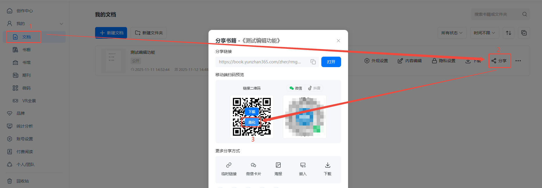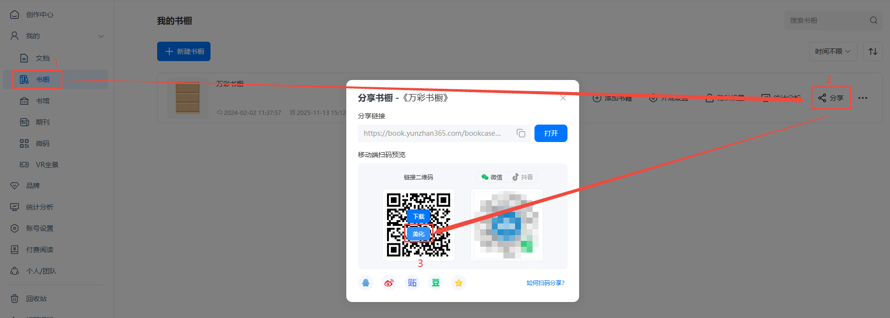 如果需要美化书本/书橱的二维码,点进【文档】/【书橱】,然后点击【分享】,将鼠标移动到链接二维码上点击【美化】。