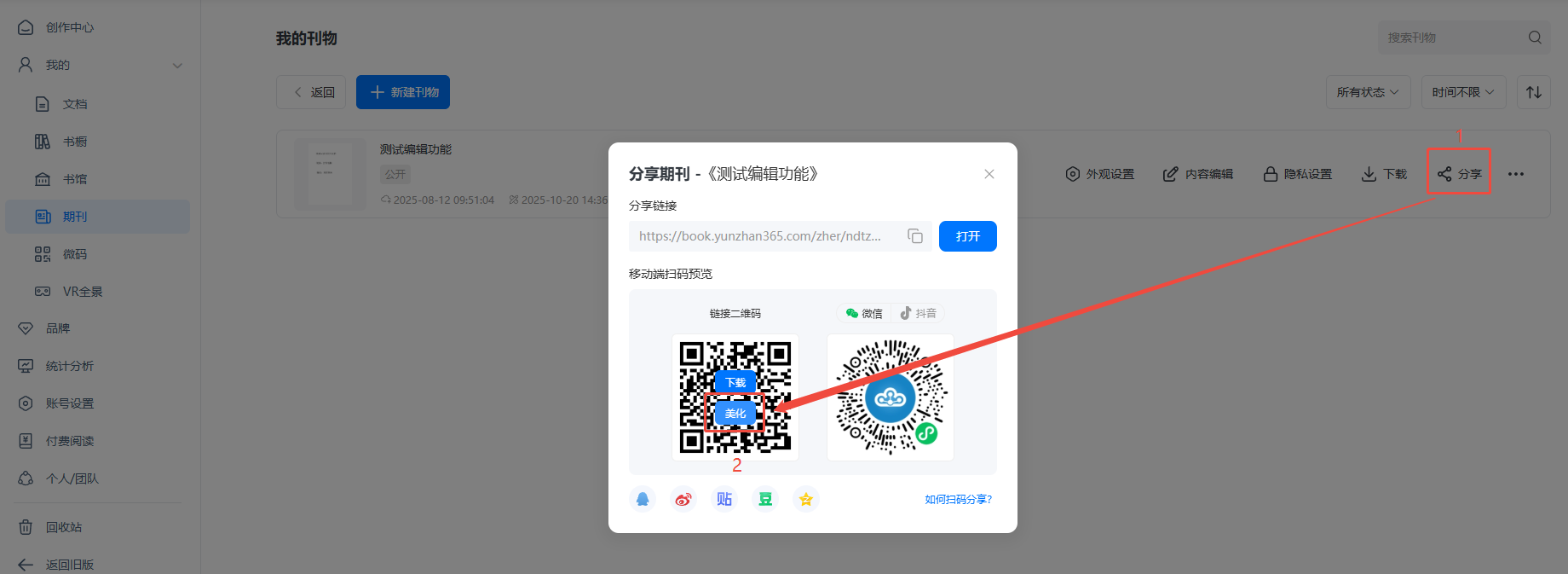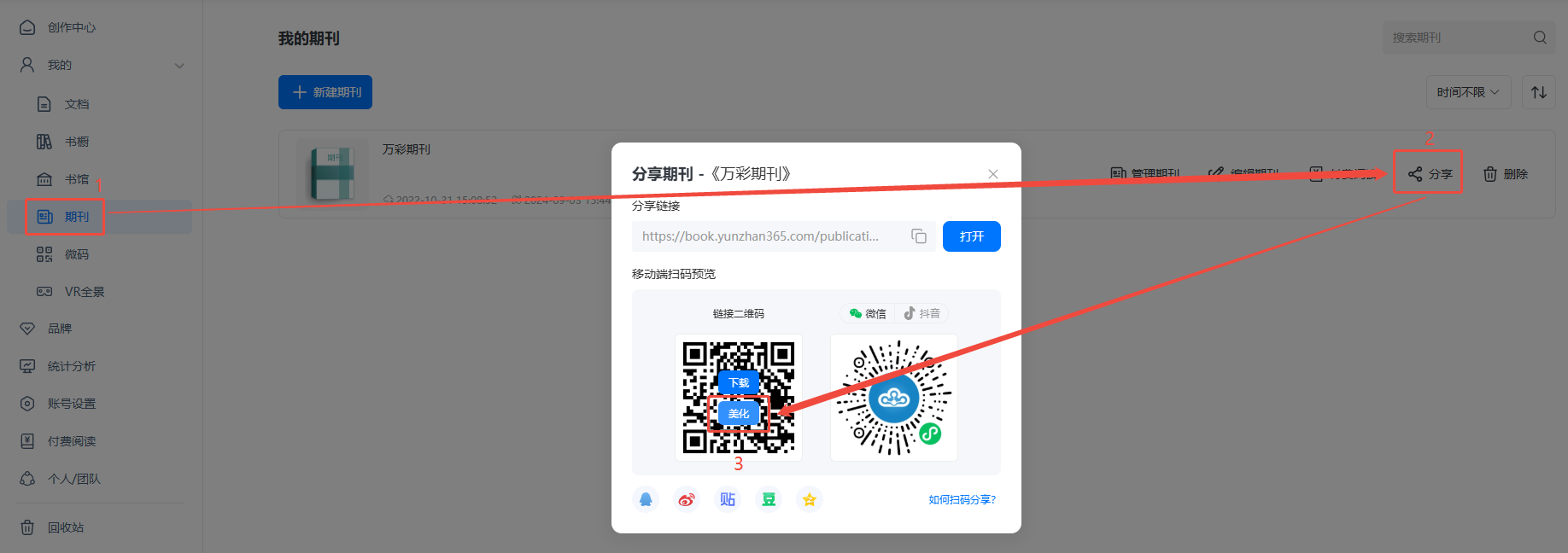 如果需要美化期刊集的二维码,点进【期刊】,点击对应期刊集的【分享】,将鼠标移动到链接二维码上点击【美化】。