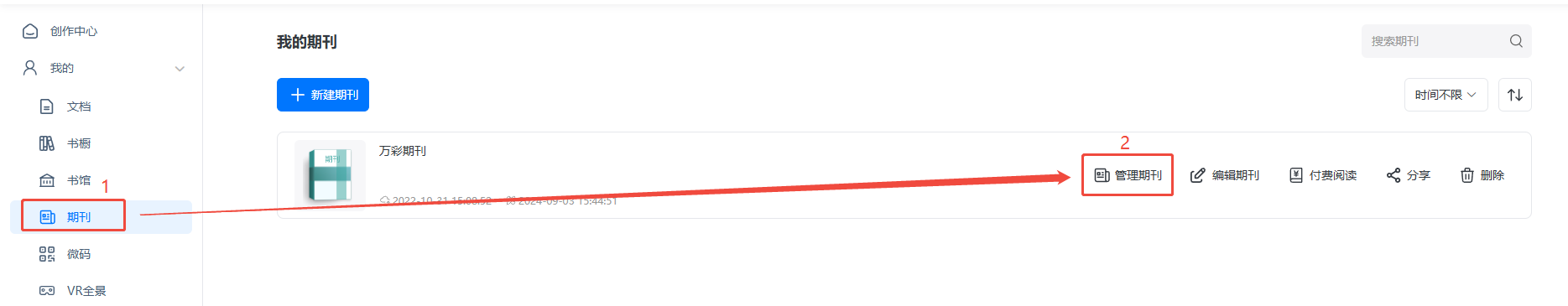 如果需要美化刊物的二维码,点进【期刊】,然后点击期刊集的【管理期刊】,最后点击刊物的【分享】,将鼠标移动到链接二维码上点击【美化】。