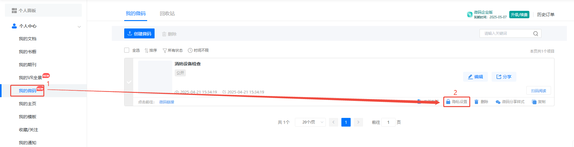 点击【我的微码】,选择需要设置密码的微码,点击【隐私设置】,打开【添加阅读密码】。