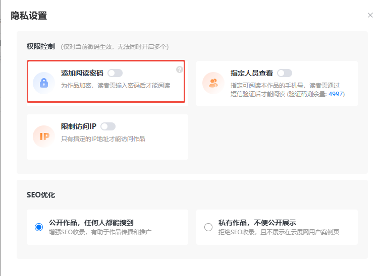 此功能可以给制作的微码设置一个或多个密码,这样读者需要输入设置的密码才可以阅读该微码,添加密码可以有效保护微码内容的安全性和隐私。