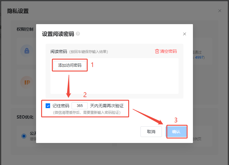 点击【访问密码】输入一个或者多个密码,如果您希望读者在设定的时间段内再次访问时无需重新输入密码验证,还可以选择勾选下方的【记住密码】,并设置密码间隔时间,最后点击【确认】。
