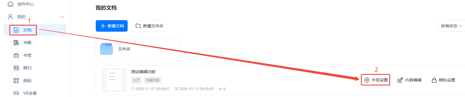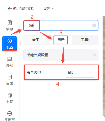 如何更换电子书的装订样式? 一、功能介绍 此功能可以给电子书加上装订样式,让其更像一本书。 二、操作步骤 1、打开外观设置 点击【文档】,找到对应的电子画册,点击【外观设置】。 2、设置装订样式 点击【设置】,上方搜索【书脊】,然后点击【显示】,在【书脊类型】选择一个想要的即可自动保存。