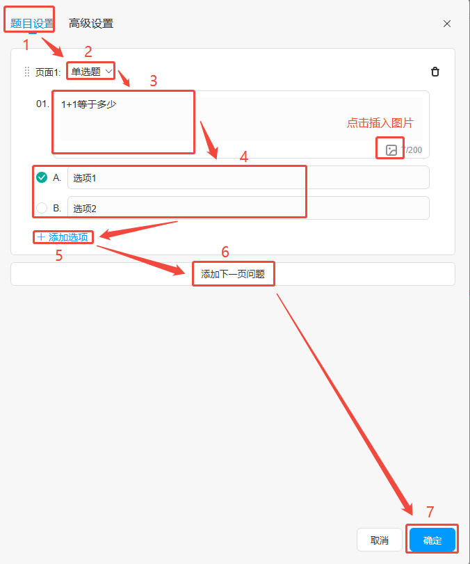 点击【题目设置】,在【单选题】选择题目为单选题或者多选题,下方输入问题题目,勾选其中一个选项为正确答案(如果是多选题可勾选多个),右侧编辑选项内容。