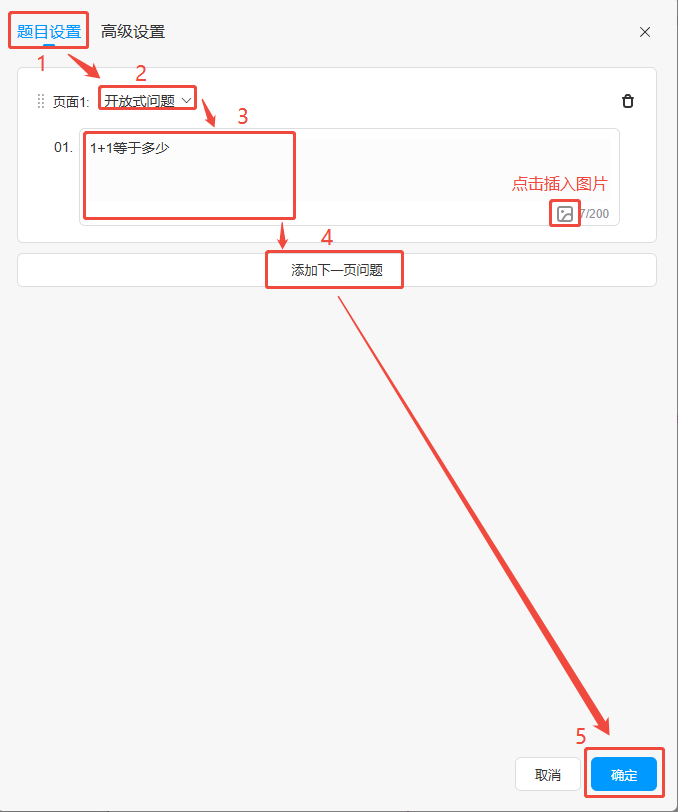 点击【题目设置】,在【开放式问题】的位置选择题目为开放式问题,下方输入问题。