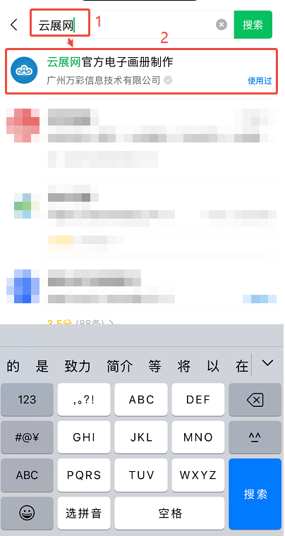 (2)上方搜索栏输入【云展网】,会出现云展网的小程序,点击进入。
