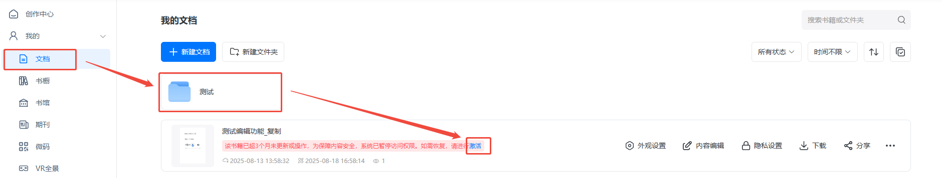为进一步保障内容安全,免费用户的书籍若连续三个月内无任何编辑、修改等更新操作,或者付费会员会员资格到期满三个月起,系统将对书籍进行暂时停止访问处理,用户登录账户并完成激活操作后,可立即恢复书籍的正常访问权限。