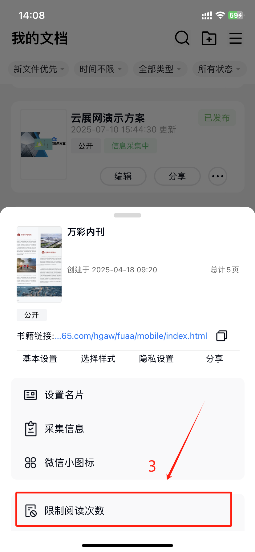 在【作品】页面,点击三个点【…】按钮打开,找到【限制阅读次数】点击