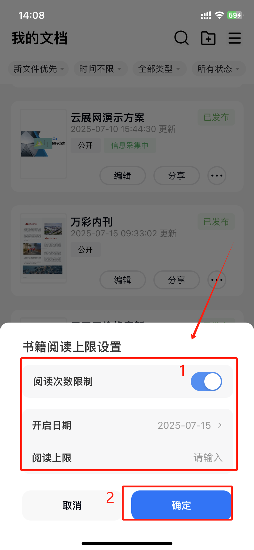 开启【阅读次数限制】,设置【开启日期】以及设置【阅读上限】次数,设置好后,点击【确定】
