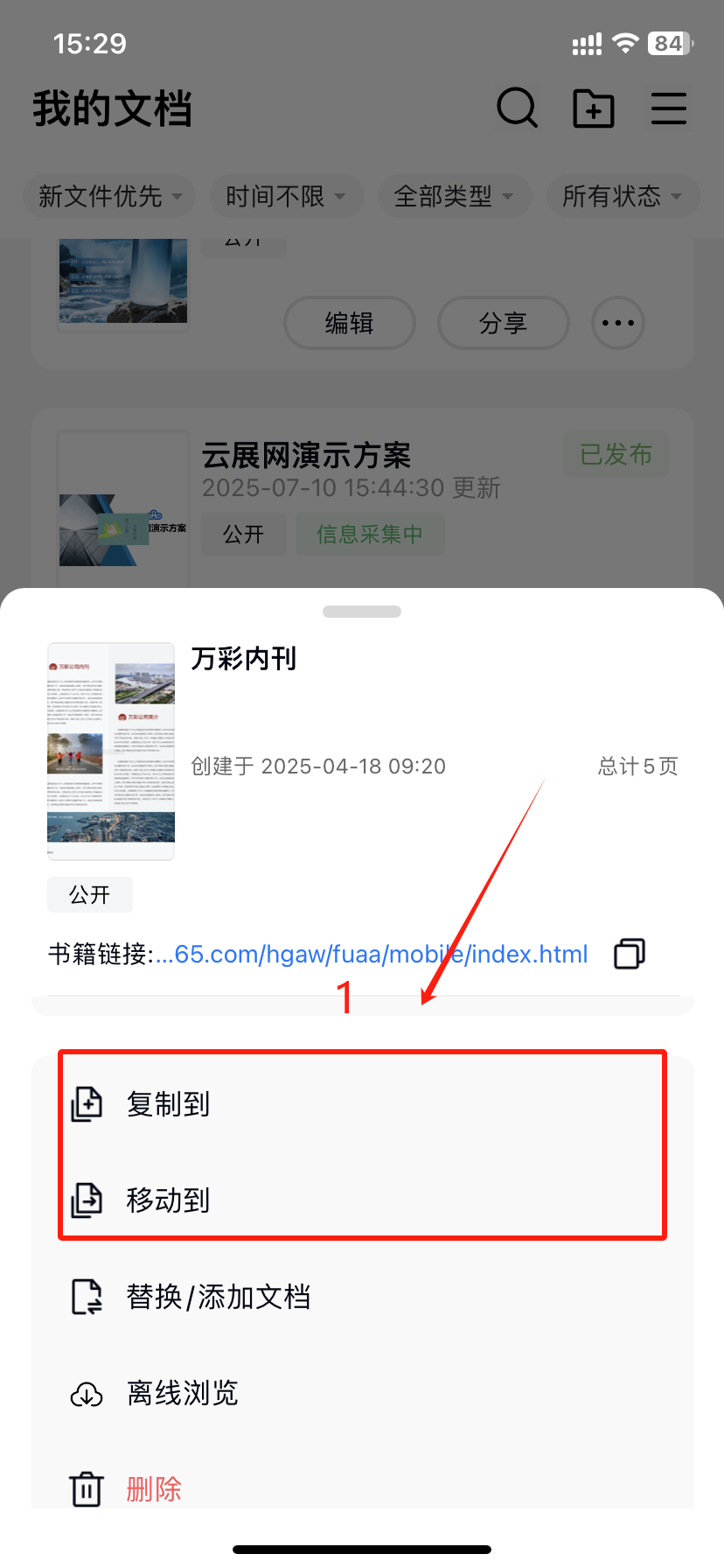 app上如何复制/移动书本? 一、功能介绍 如果您需要对书本进行管理分类或备份,可以将书本复制或移动到其他文件夹进行分类存放。 二、操作步骤 1、打开设置页面 在【作品】页面,找到需要复制/移动的书本,点击三个点【…】打开 2、复制/移动书本 往下滑动页面,根据自身需求,点击【复制到】或者【移动到】后,选择文件夹后点击【确定】 3、查看复制/移动的书本 在【作品】页面点击您选择的文件夹进入后可以找到书本