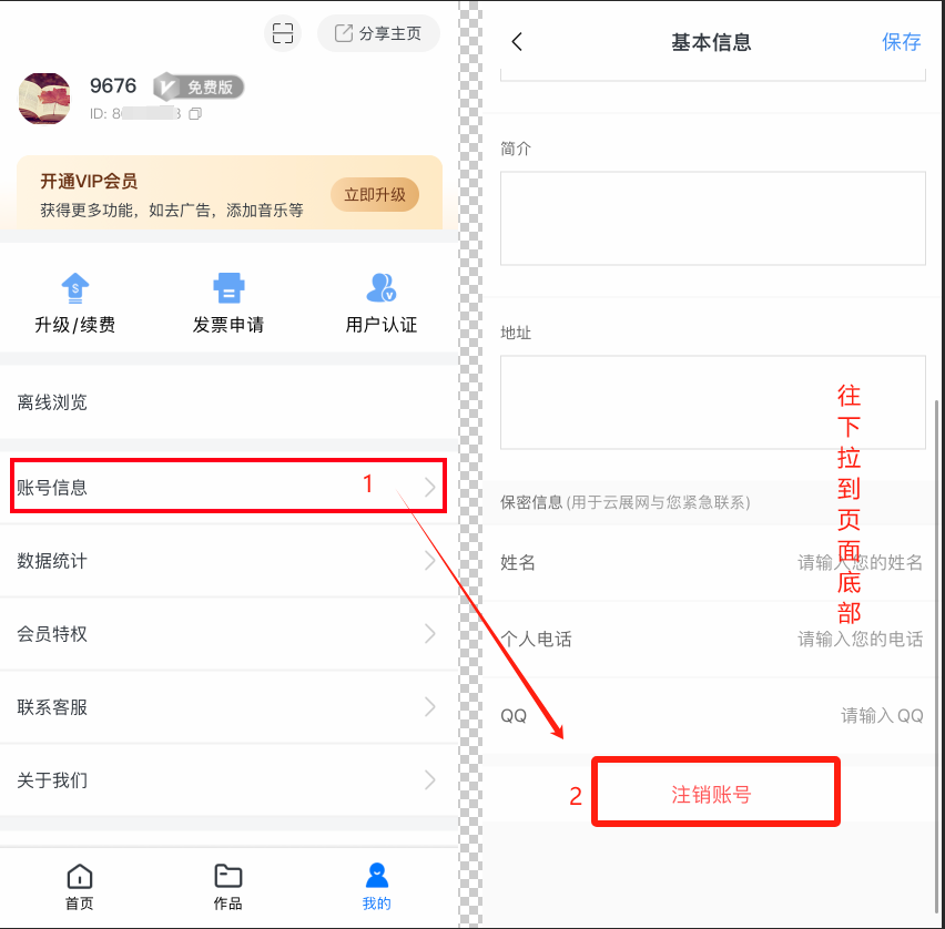 在【我 的】页面,点击【账号信息】,拖动到页面底部,点击【注销账号】。