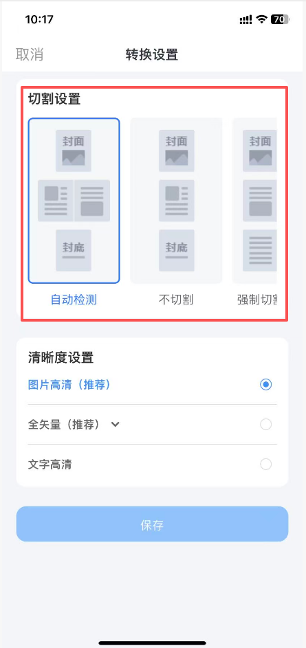 点击【转换设置】打开,选择切割方式后,点击【保存】,随后继续上传文档进行制作