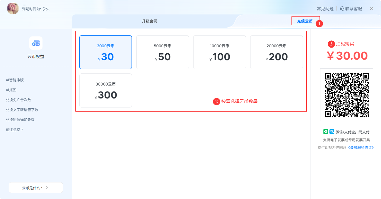 点击右上角的头像,或者在【上传文件】按钮下方, 鼠标悬浮在云币数值上,均可查看当前账号剩余云币或点击【购买云币】、【立即充值】,根据自身需要选择购买更多云币。