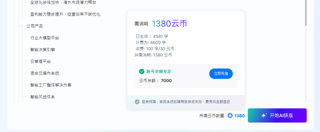 收费时机: 大纲生成完成后,用户浏览计费明细,点击【开始AI排版】按钮,即扣除云币。