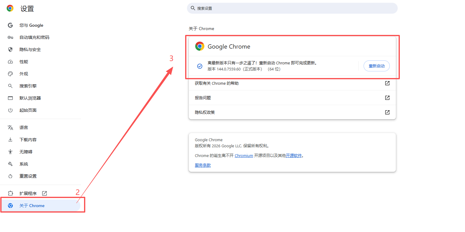 点击右上角三个点图标?,点击【设置】,在关于 Chrome页面将自动加载,顶部显示当前版本号(如“版本 144.0.7559.60(正式版本) (64 位)”),若显示“已是最新版本”或类似提示,表明当前为最新版本。??若提示“重新启动即可更新”或“有新版 Chrome 可用”,则需更新。
