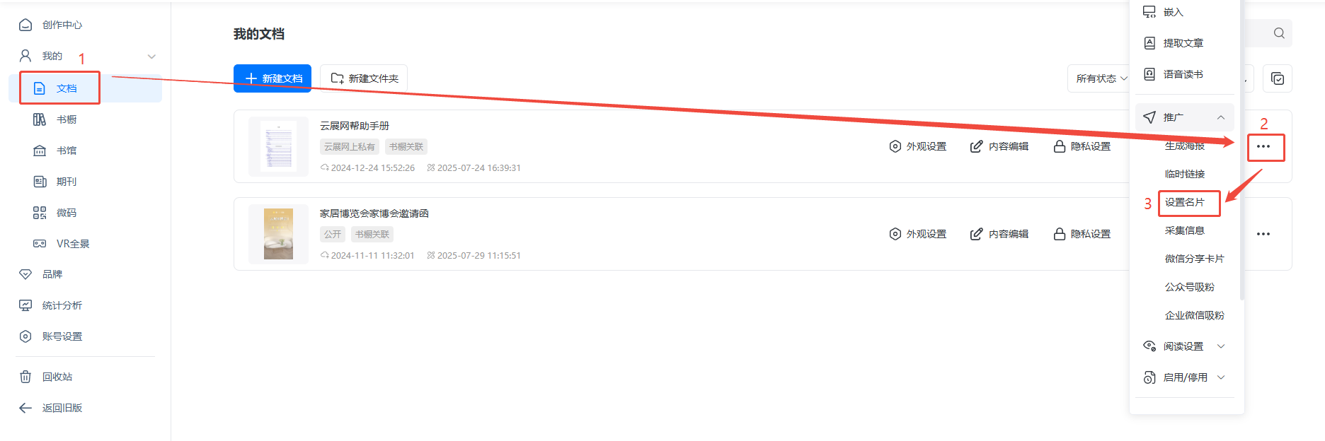 点击【文档】,选择需要的电子书,点击右边三个点,选择【推广】,点击【设置名片】,打开名片设置界面。