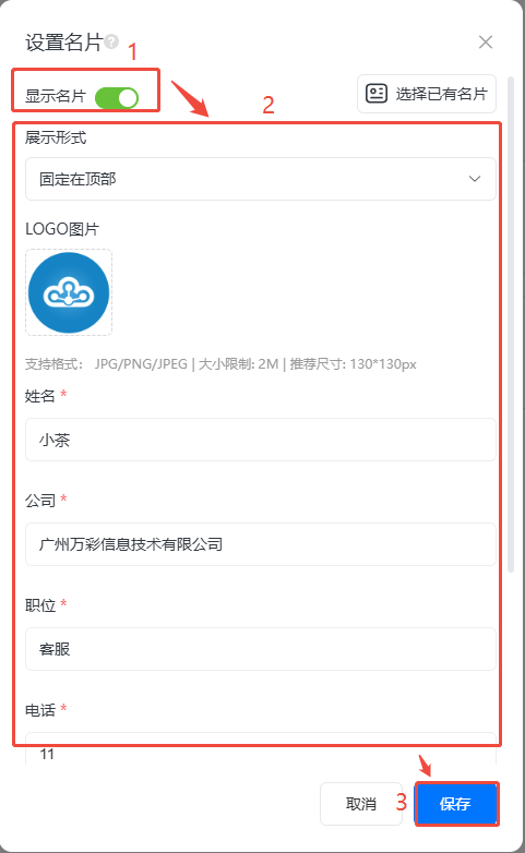 打开【显示名片】,选择一个【展示形式】,下方上传logo输入对应信息后,点击保存即可。