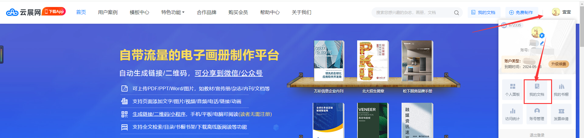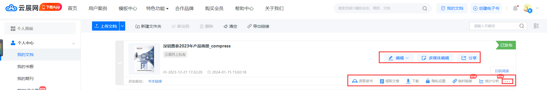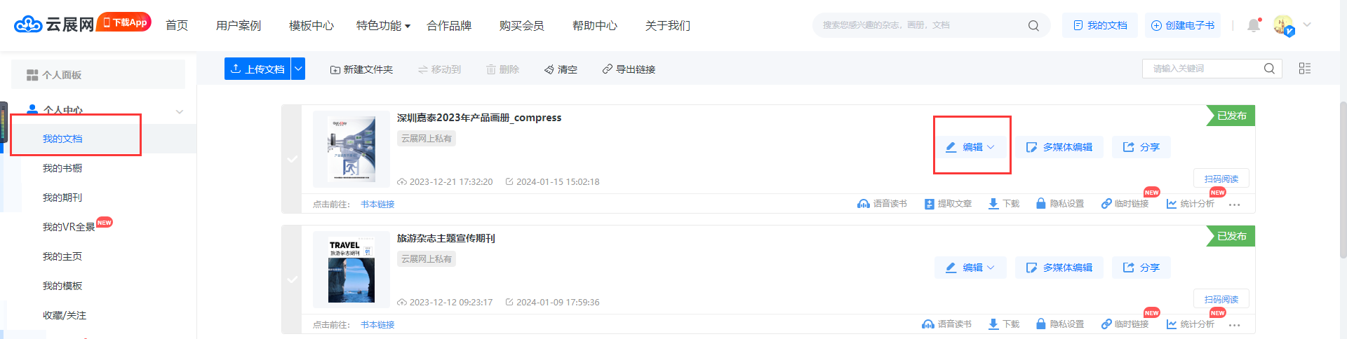 管理、修改电子杂志设置 创建杂志上传审核完毕之后,需要更改杂志设置,可以在登陆账号后,鼠标放在云展网右上角的头像处,点击“我的文档”,就能见到自己上传的书本了。 下面请看下红框中的编辑按钮,就是用于修改书本配置的: 编辑杂志:上传好的杂志可以通过编辑杂志更改各项功能,同步预览各种设置,更改杂志下载格式以及切割功能。具体功能请看编辑杂志功能介绍。