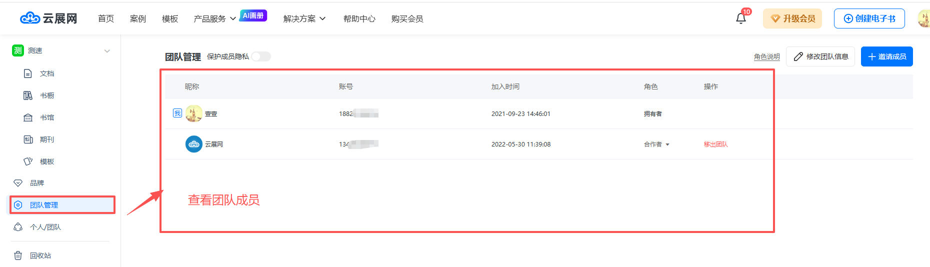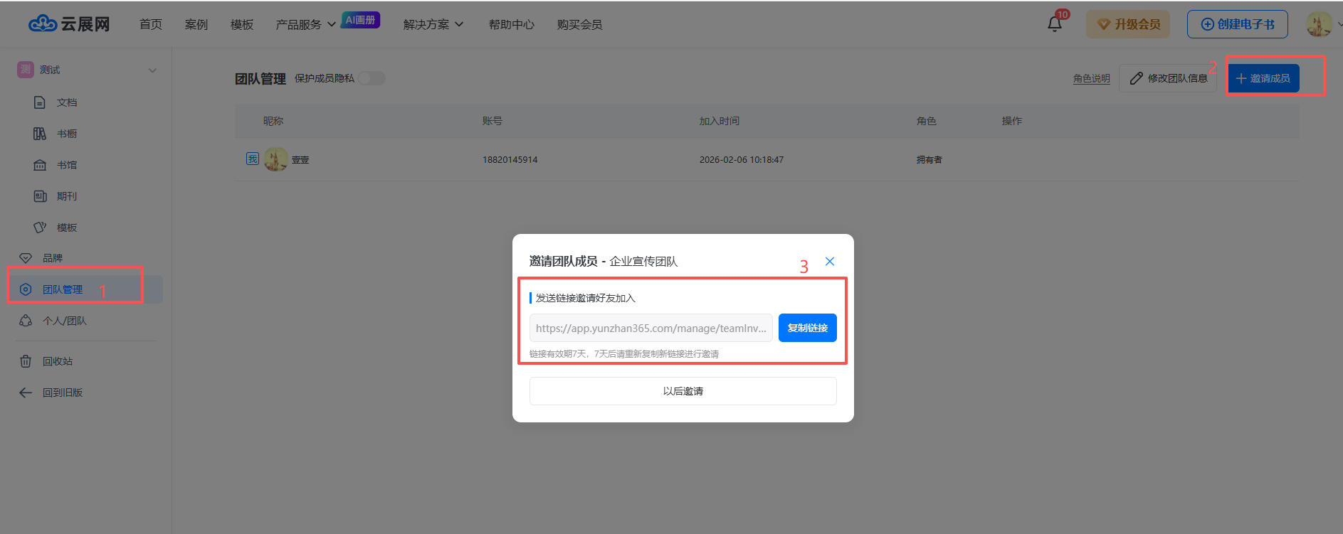 点击【团队管理】,点击右上角的【邀请成员】按钮,会有一个邀请链接,复制后发给好友,好友点击链接进去即可申请加入团队。