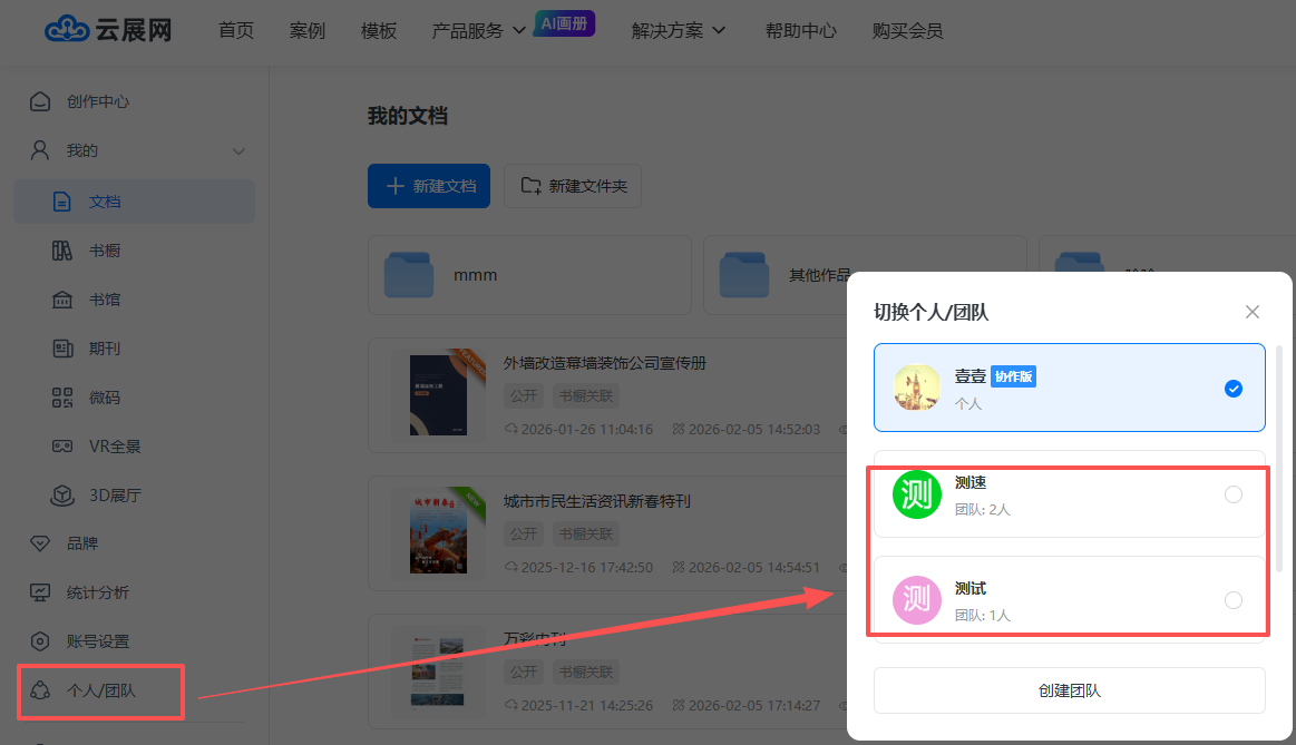 点击【个人/团队】,点击已创建好的团队打开。