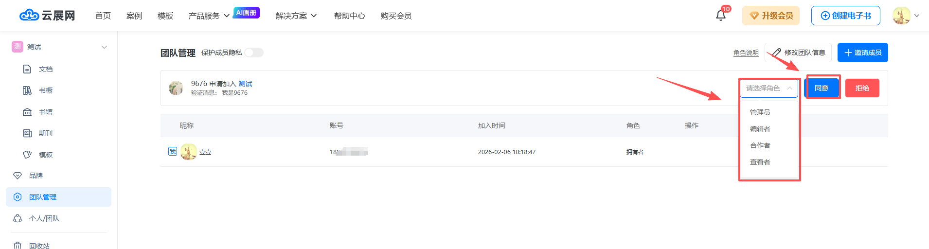 当被邀请人同意加入团队时,页面会弹出申请消息。主账号需同意被邀请人加入,并为其分配角色。不同的角色有不同的权限,共有五个角色,其中主账号为拥有者,协作子账号有四种角色:管理者、编辑者、查看者和合作者。每个角色具体的差别请看教程:《角色权限说明》。