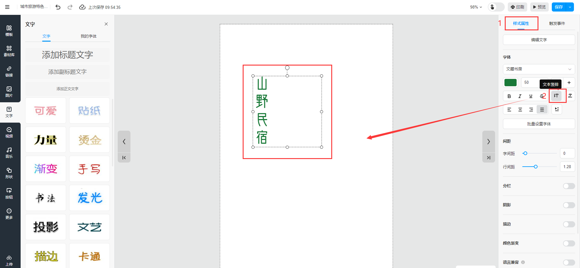 选中文本内容进入【样式属性】,点击【文本竖排】即完成。