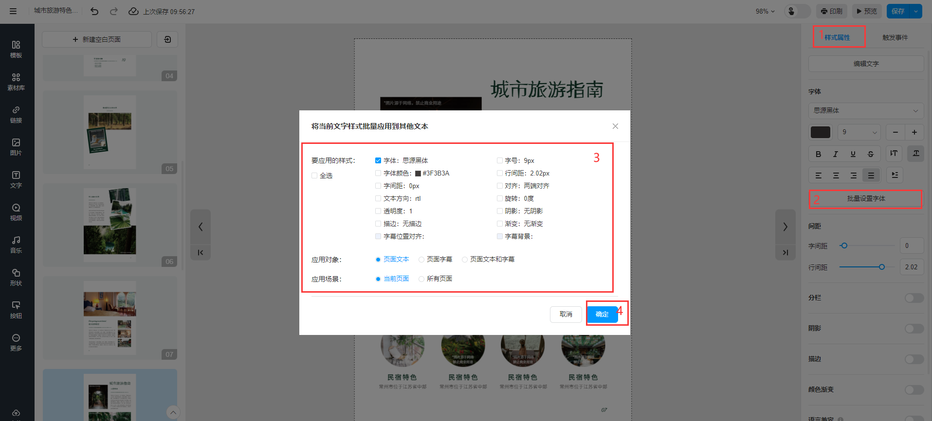选中文本内容进入【样式属性】,点击【批量设置字体】,勾选要应用的样式、对象以及场景,并点击【确定】完成批量应用。