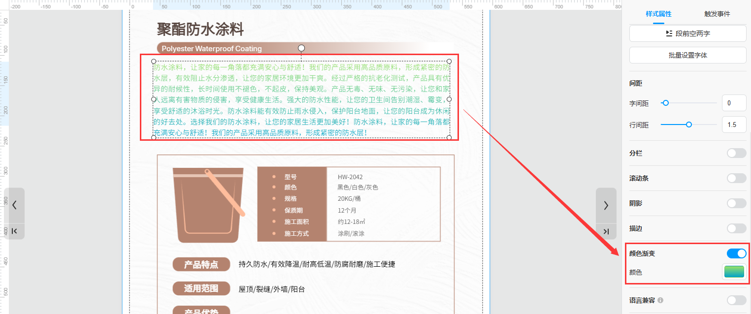 选中你所需要修改的文本框,打开【颜色渐变】,并选择喜欢的颜色,就可以给文字段落增加颜色渐变的效果。