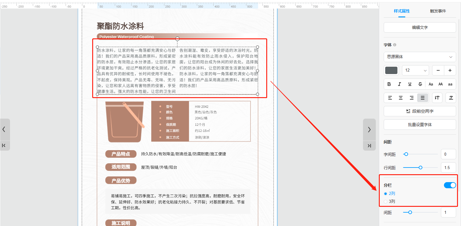 选中你所需要修改的文本框,打开【分栏】,文字段落会自动分成对应数量的栏目。