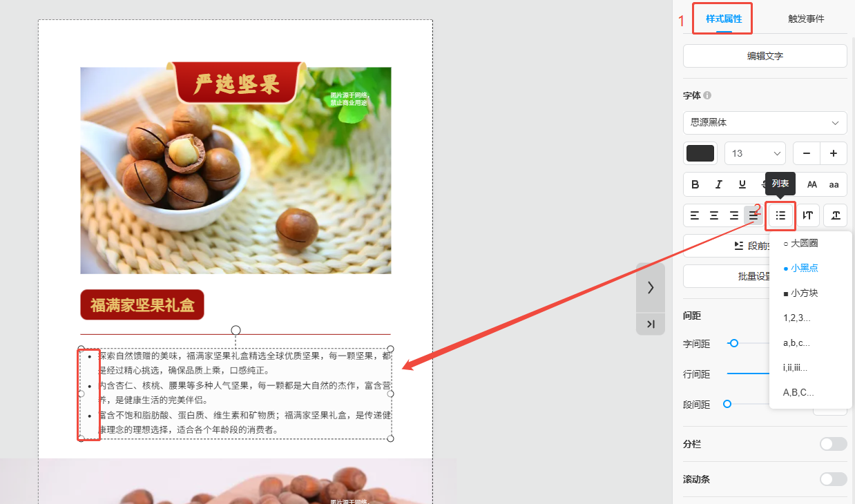 双击文本框进入编辑状态,点击【列表】选择符号样式,文本里的每一段前面将会添加一个符号。