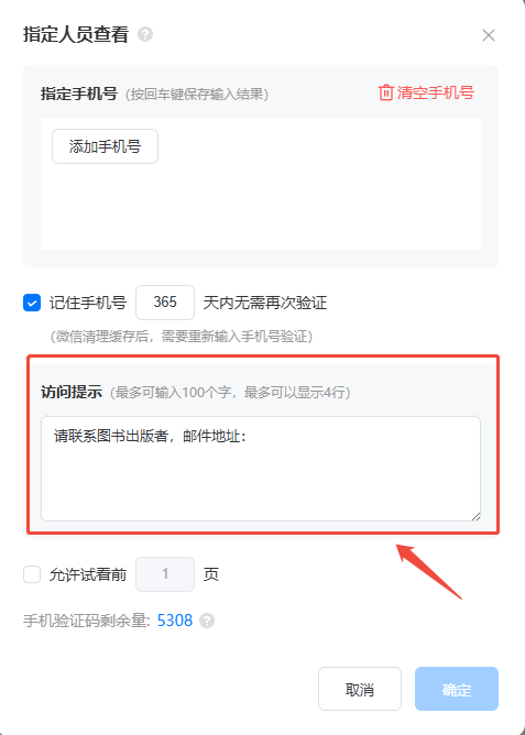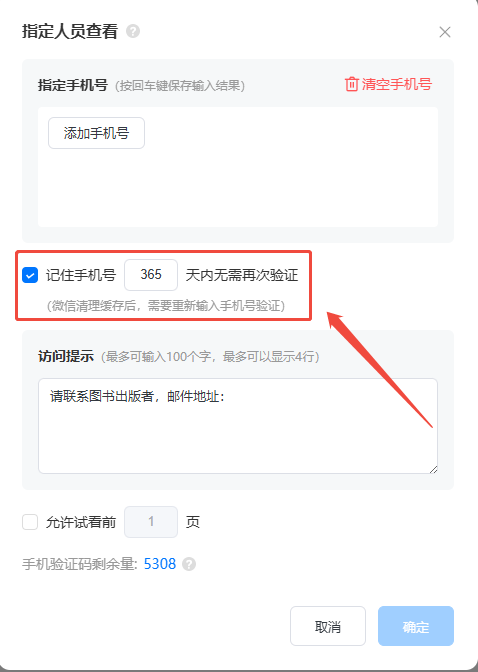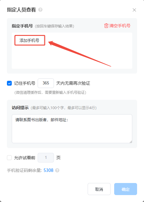 如果你想将电子书/书橱给特定的人看,可以设置指定人员查看功能。指定人员查看就是作者在后台设置哪些手机号可以访问,然后读者打开电子书/书橱的时候需要通过手机号验证,可以有效避免读者分享给其他人看。