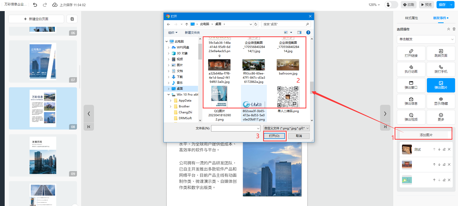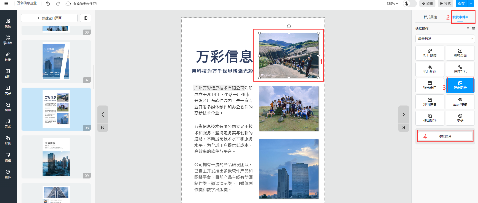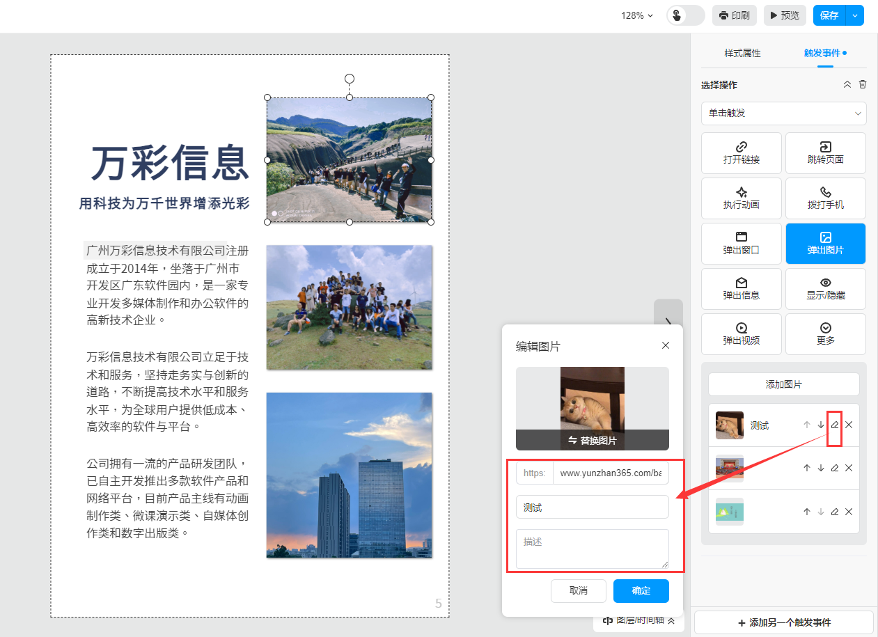 ①、选中需要弹出图片的位置,可以是文字或者图片,然后点击【触发事件】选择【弹出图片】