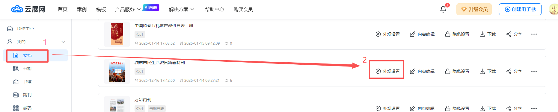 点击【文档】,找到需要设置的书本,然后点击【外观设置】,打开编辑界面。