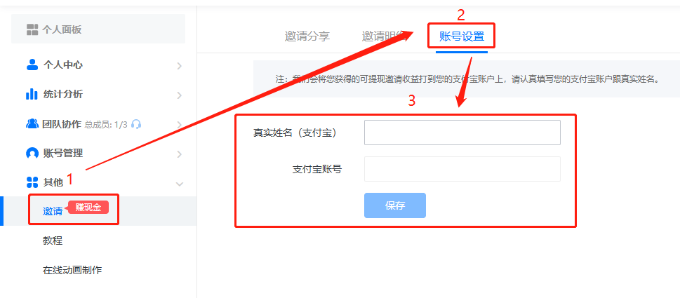 点击【邀请】,然后点击【账号设置】,下方填写支付宝真实姓名和支付宝账号,并保存。