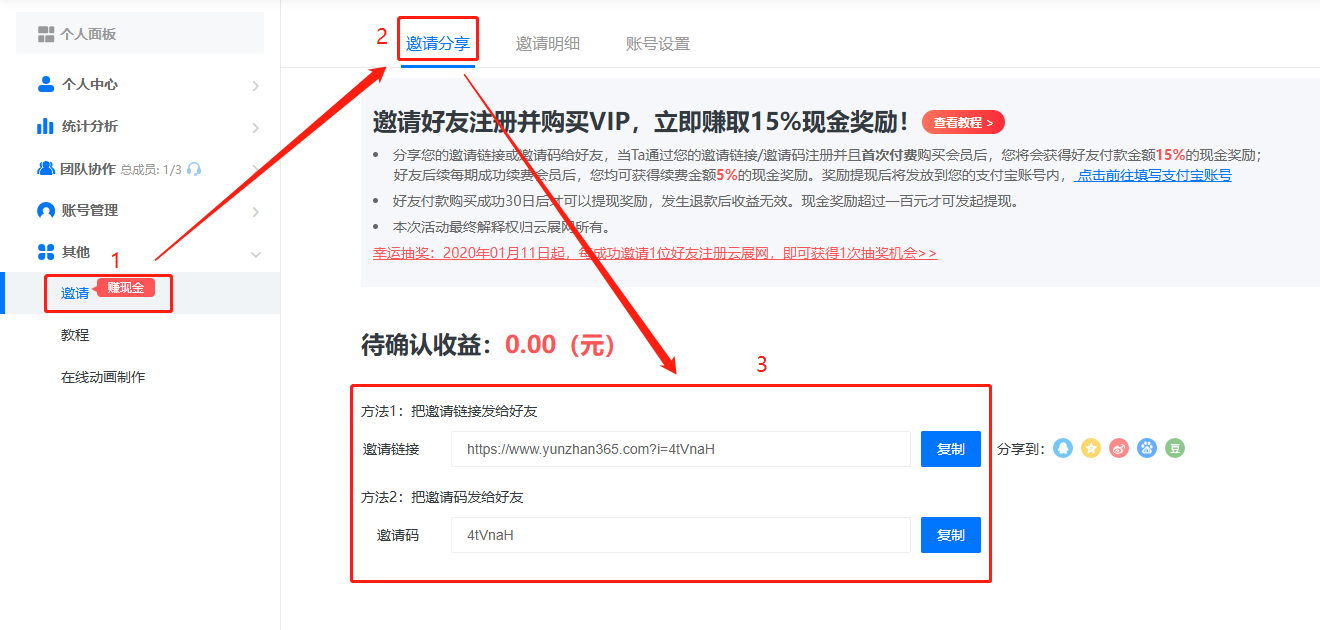 如何用云展网邀请好友购买会员赚现金奖励?只需要分享您的邀请链接或邀请码给好友,当好友通过您的邀请链接或者邀请码注册,并且购买付费会员后,您将获得相应的现金奖励。
