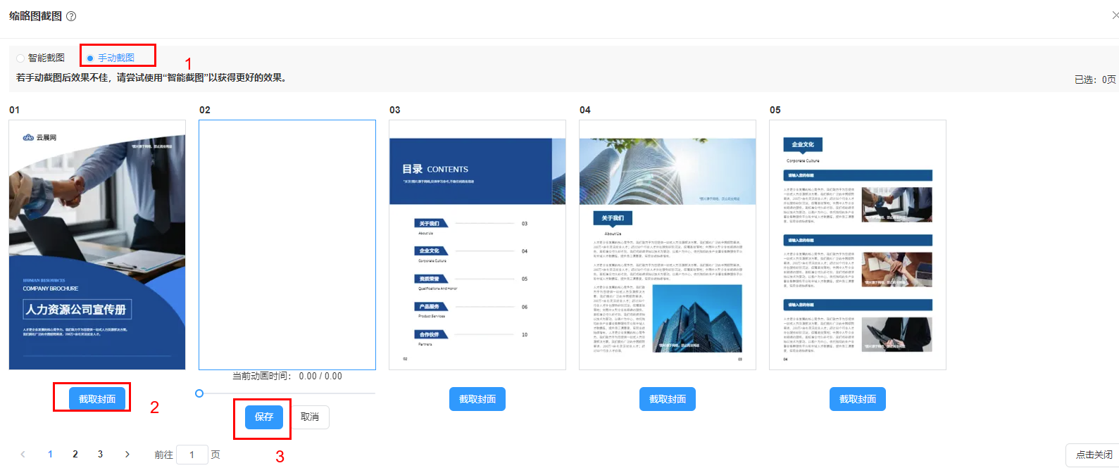 选择【手动截图】,点击每张页面下方的【截取封面】,并点击保存,即可完成截图。