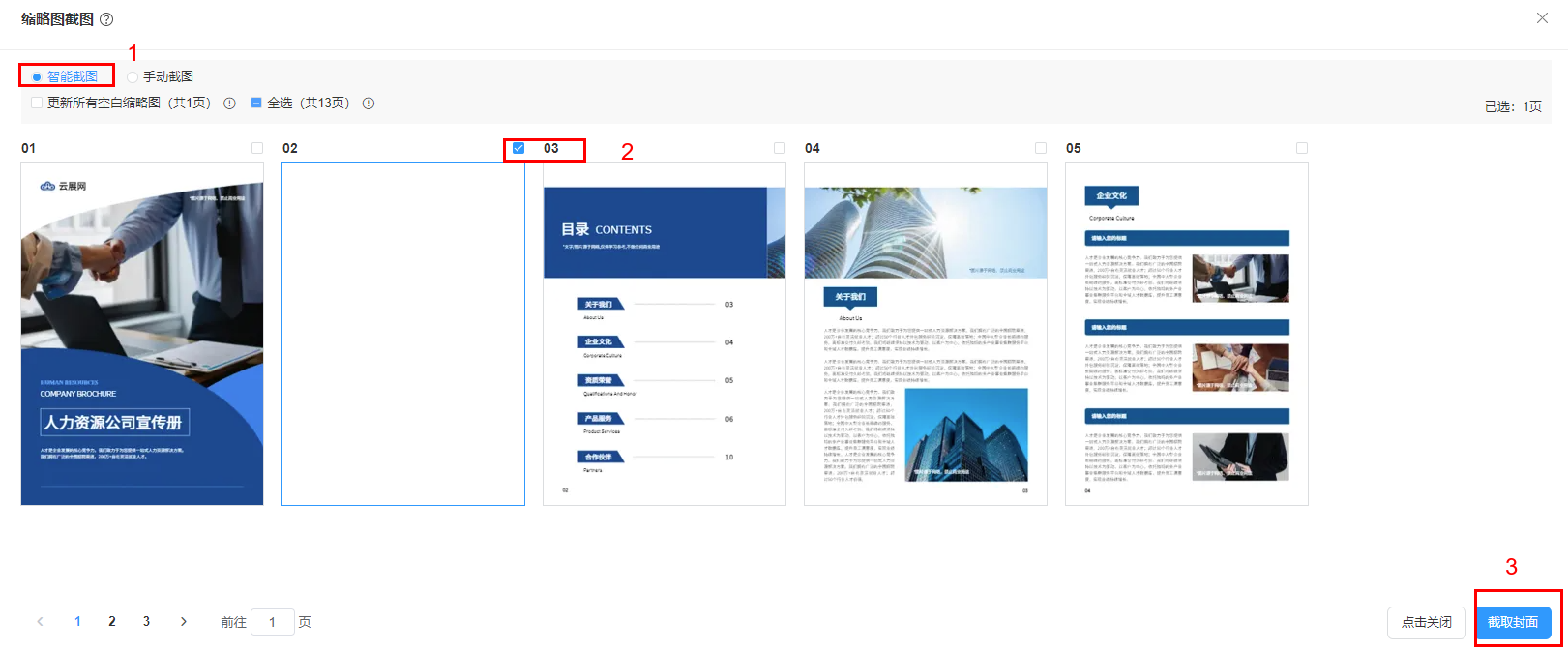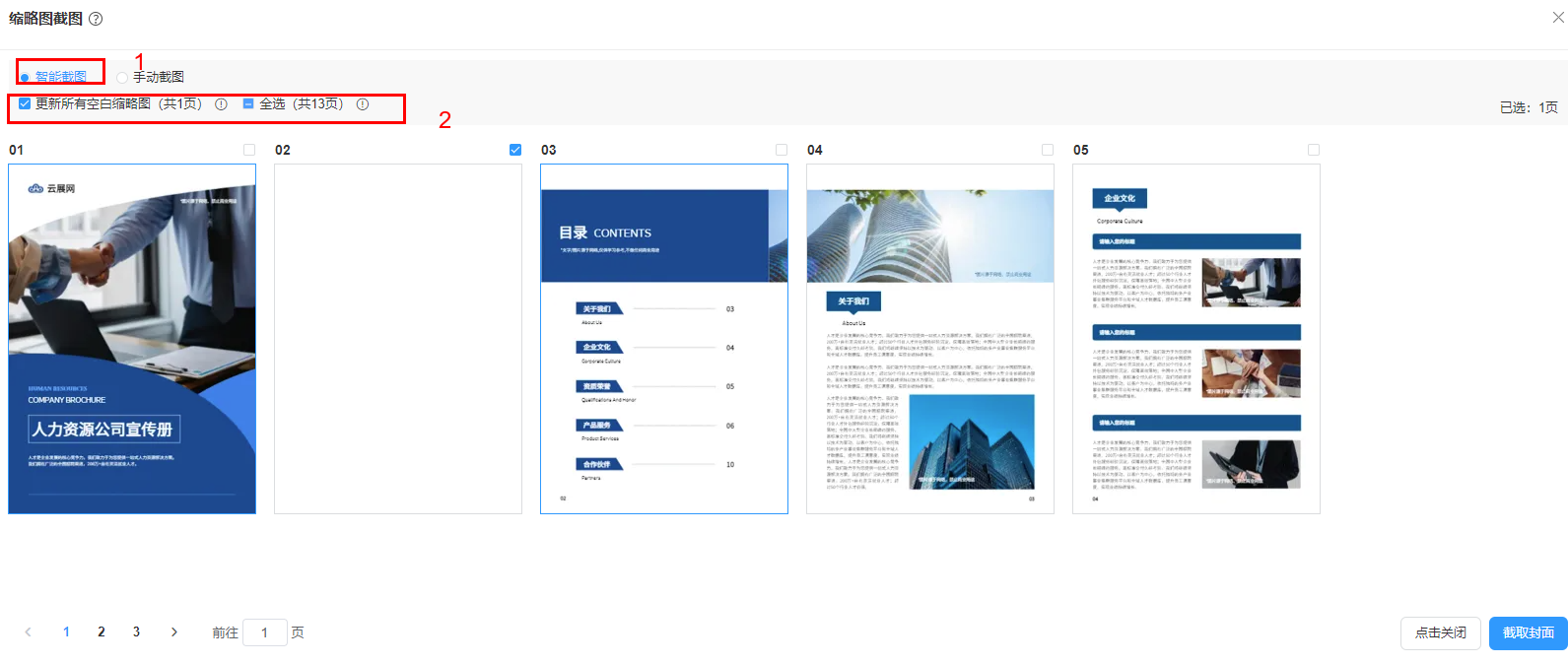 选择【智能截图】,勾选你需要截图的页面,点击【截取封面】后,等待生成并截图完成。