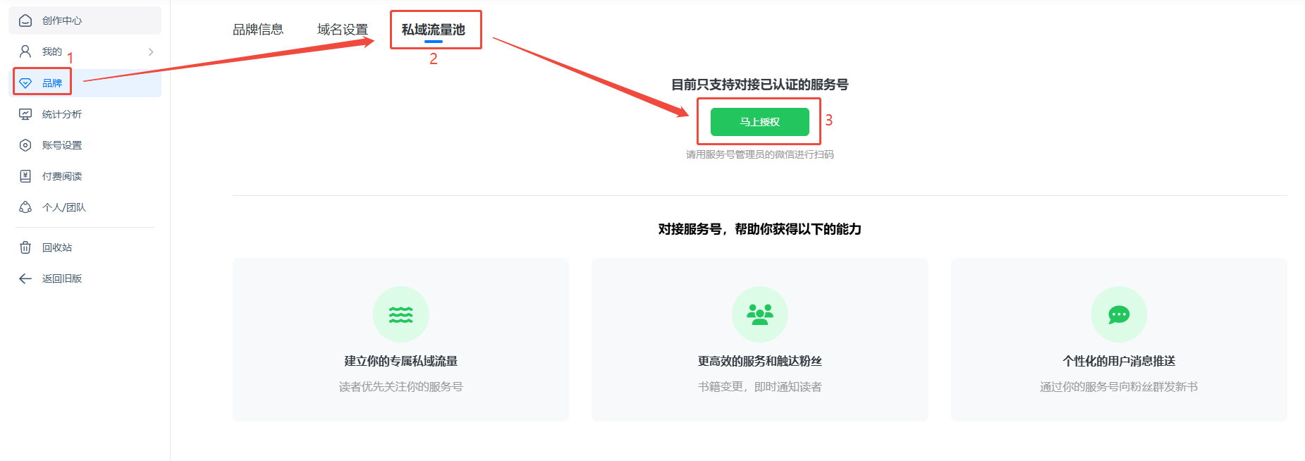 (1)点击【品牌】,然后点击【私域流量池】,点击【马上授权】。