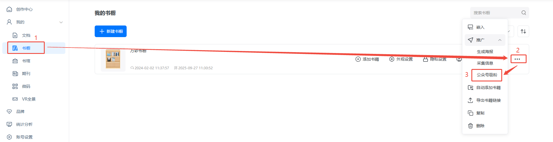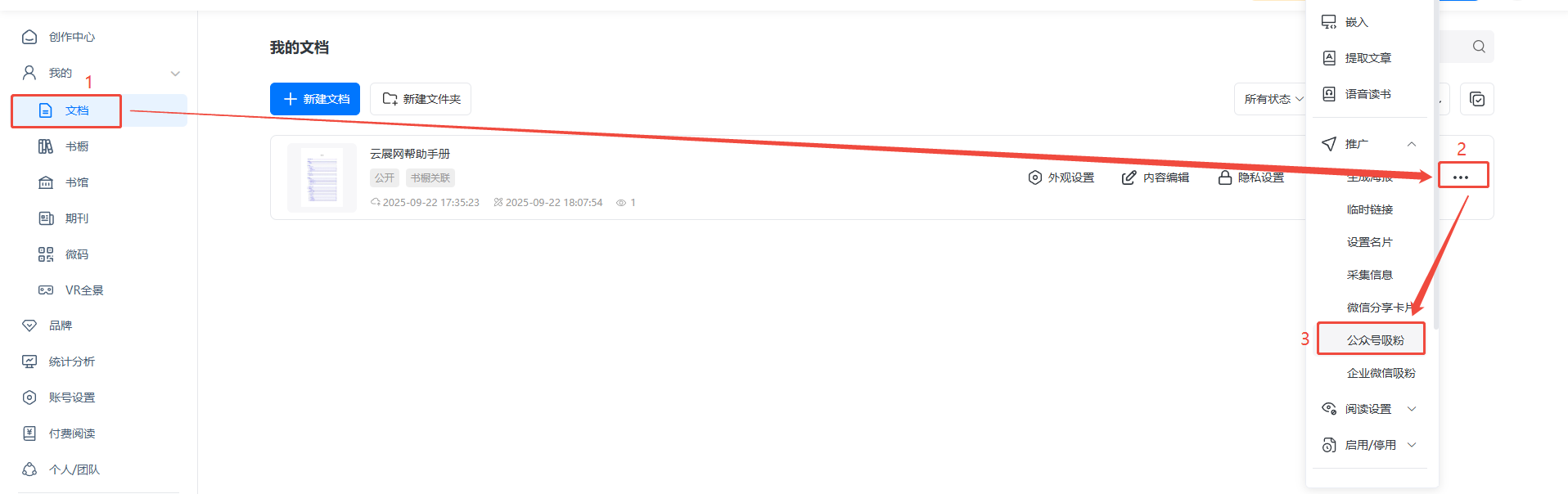 (1)选中【文档】/【书橱】,点击右边三个点,然后点击公众号吸粉。